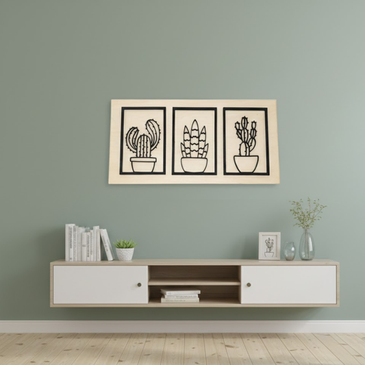 Cadre Mural Bois Tryptique Cactus et Succulentes