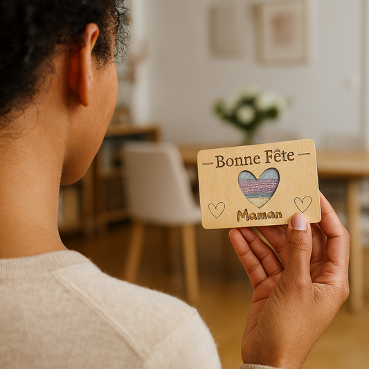 Le bois offre un toucher doux, une texture unique, et une présence chaleureuse. Chaque pièce est différente, vivante, marquée par ses veinures naturelles. Offrir un porte carte cadeau en bois, c’est offrir quelque chose de personnel, de sobre, et de sincère.