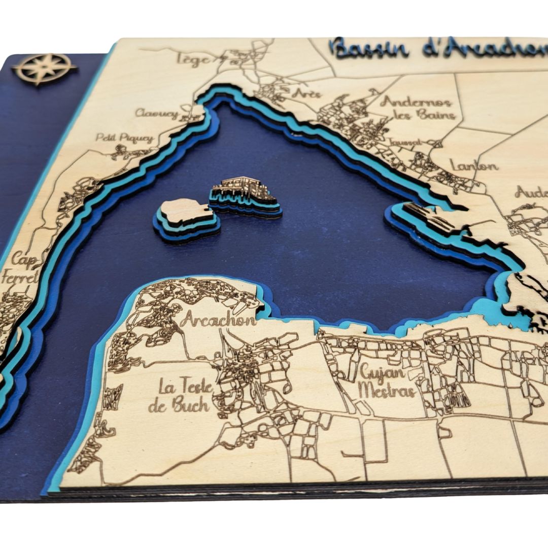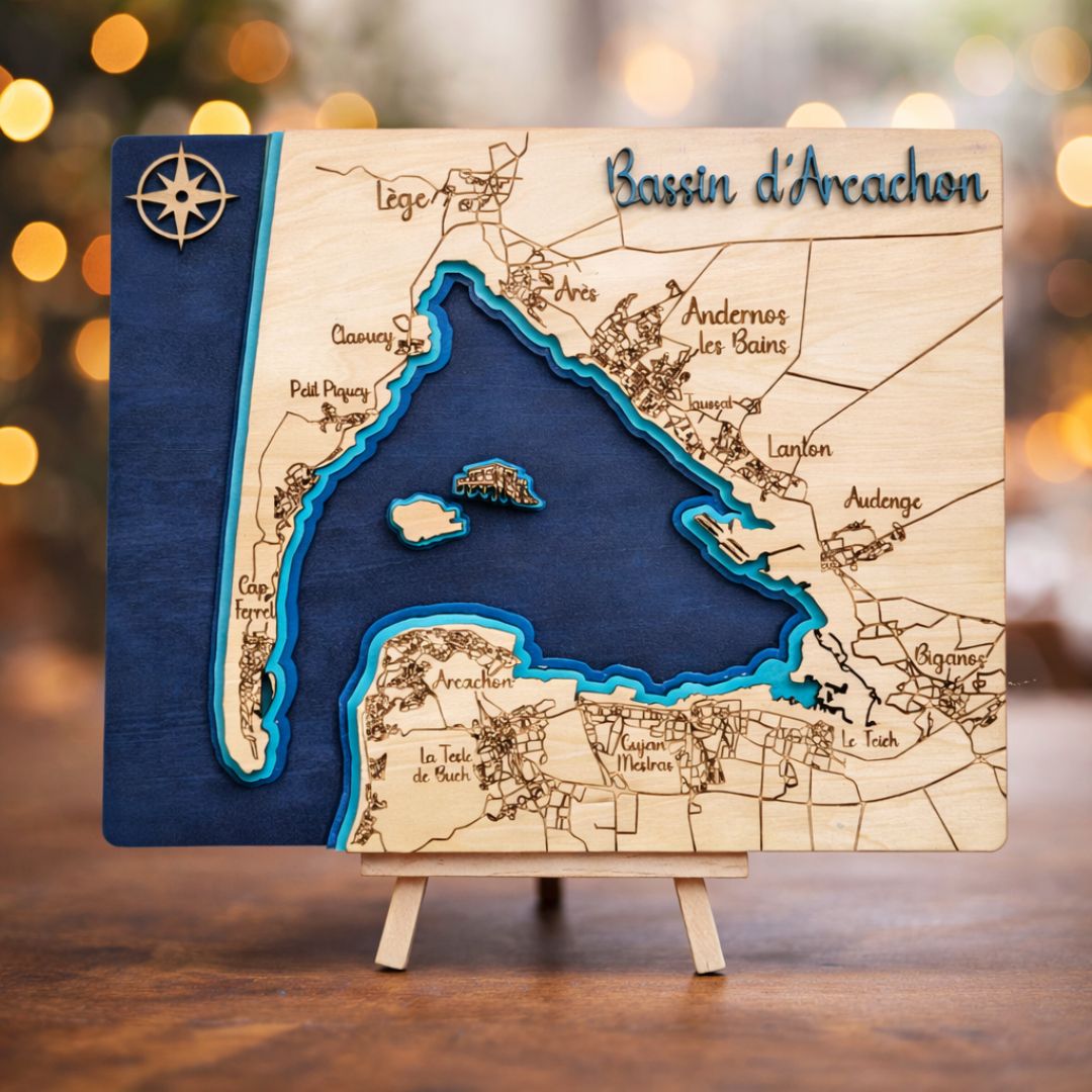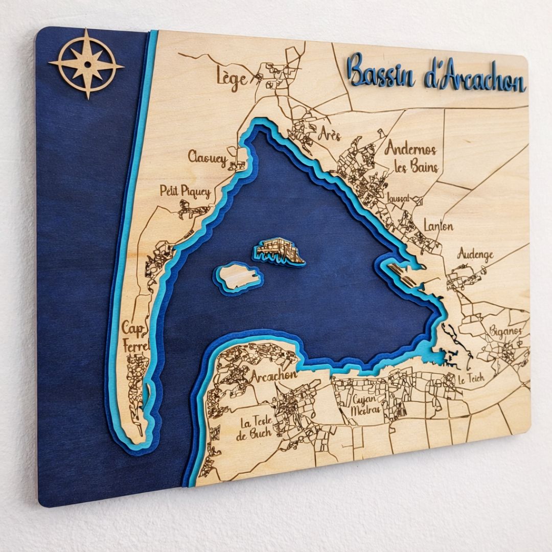 Chaque couche de bois est découpée avec précision puis superposée afin de créer une profondeur réaliste. Ce travail multicouches donne naissance à une véritable carte en relief du bassin d’Arcachon, où les contours du littoral prennent vie.